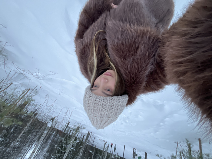 This image depicts an outdoor winter scene in Noviy, Russia. A female subject is prominently featured in the foreground, captured in a self-portrait, with her gaze directed downwards towards the camera. She wears a light beige, ribbed knit beanie and a thick, dark brown fur coat. Her partially visible hair is light brown with blonde highlights. A small metallic stud is present in her left nostril. The environment is uniformly covered in a deep layer of white snow. In the mid-ground and background, a snow-covered path or slope ascends through a mixed forest comprising both coniferous and bare deciduous trees. Several small, indistinct human figures are visible in the far background, appearing to walk uphill along the snowy path. The scene is illuminated by diffuse natural light, consistent with an overcast sky during daylight hours.