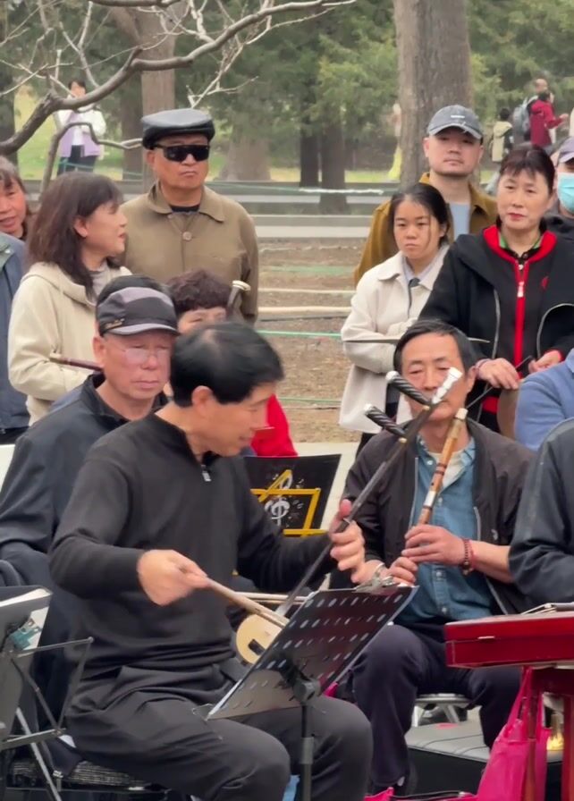 A group of older Asian musicians play to a small crowd of people in a park or public area. The musicians, seated, are playing various traditional Chinese instruments, including a bowed string instrument similar to a violin, and a flute-like instrument. One musician plays a percussion instrument. They are using sheet music on stands. The people in the crowd are diverse in age and dress, watching the musicians with varying expressions. Some people in the crowd also hold similar instruments. The setting is a park, with trees visible in the background.