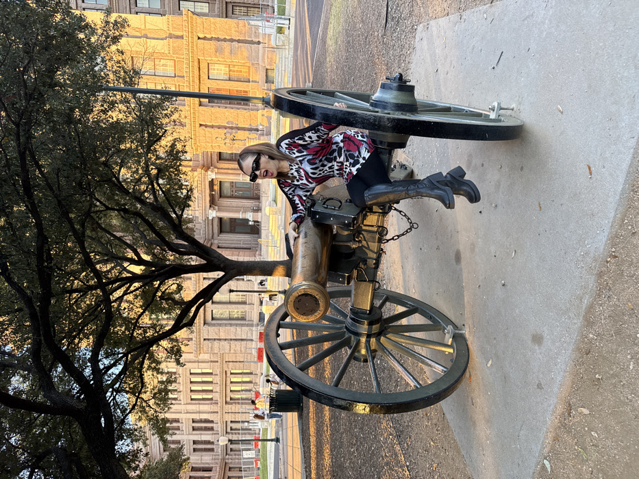 A woman in a patterned top, black leggings, and boots is posing on an antique cannon. The cannon has large wooden wheels and metal components. Behind the cannon is a large building with many windows, likely a historical or government structure. A tree with bare branches partially obscures the view of the building. The scene is captured outdoors, possibly on a public square or park. The image is rotated slightly.