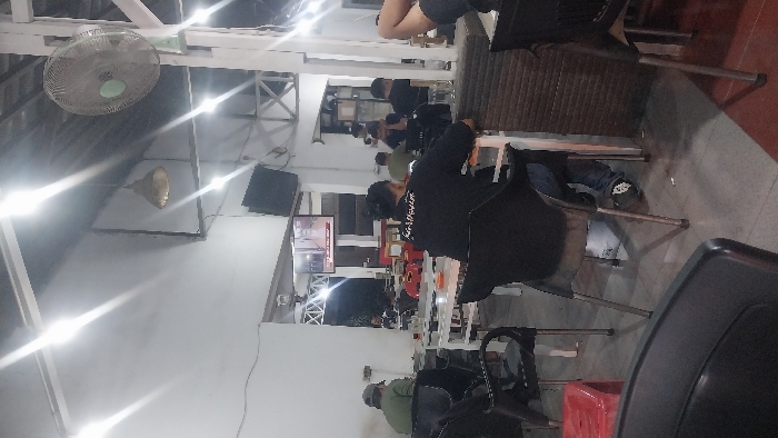 A cafe scene shows people seated at tables. A large ceiling fan rotates above. Several individuals are focused on televisions mounted on the wall. Various tables and chairs populate the space, some occupied, others empty. The lighting is bright, with a mix of natural and artificial light illuminating the room. The overall atmosphere appears casual and relaxed.