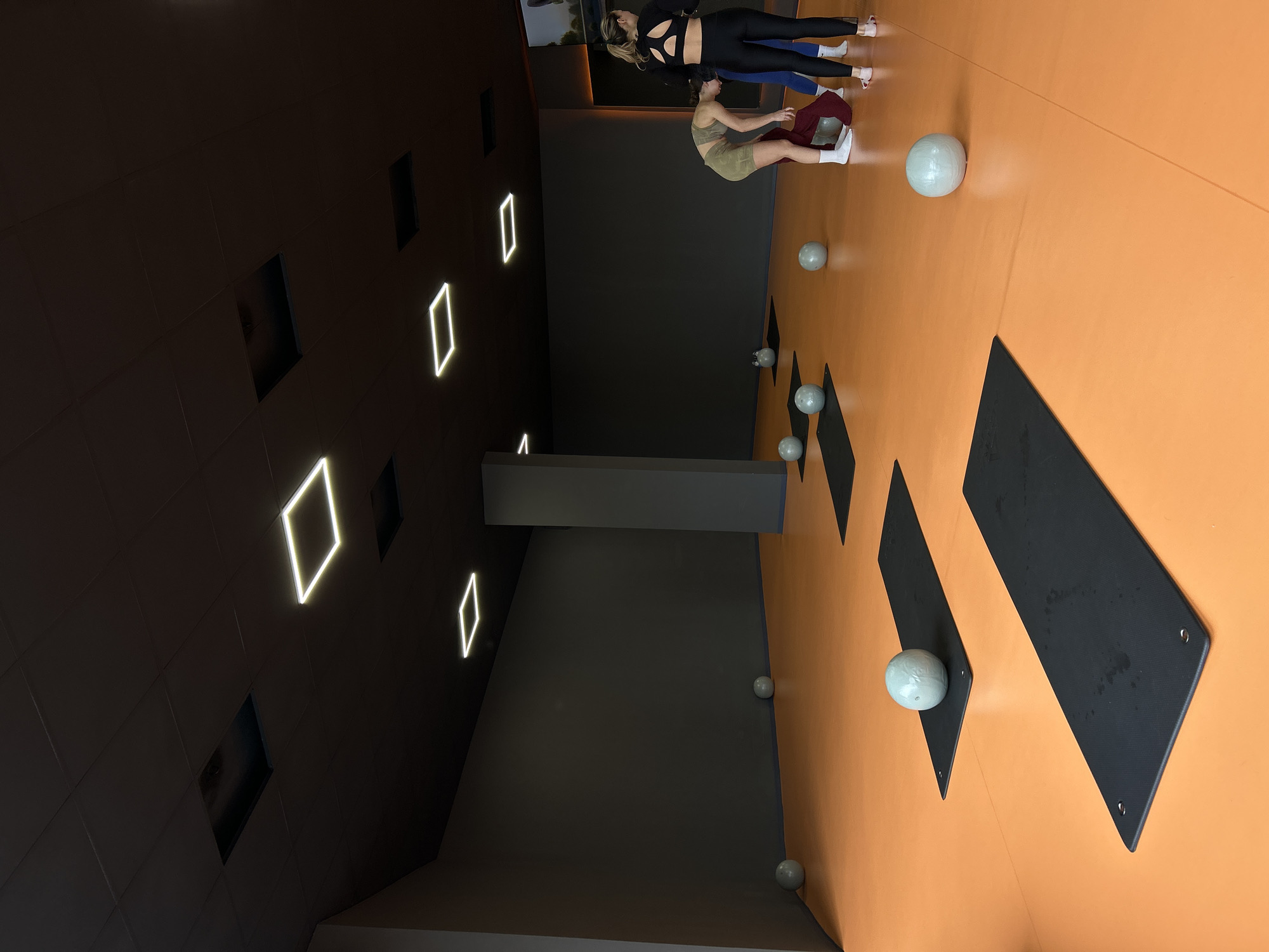 The image depicts the interior of a gym or fitness studio. The room has a unique design with an orange floor and a dark gray ceiling and walls. There are diamond-shaped light fixtures embedded in the ceiling, along with dark rectangular recessed features. Two individuals are visible in the top corner of the frame, engaged in an exercise activity, possibly stretching or yoga. They are dressed in activewear, with one wearing black and the other wearing a combination of blue and light-colored clothing. Scattered across the orange floor are gray exercise balls of varying sizes and black yoga mats, positioned in a linear fashion. There is no explicit evidence to confirm that this location is in Goce Delchev, Bulgaria.