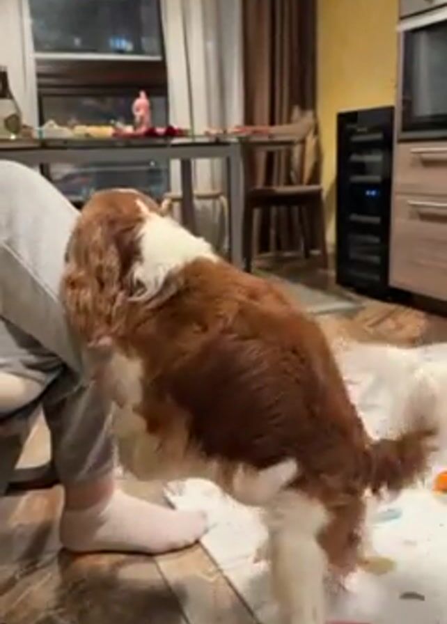 Cavalier King Charles Spaniel sitting on the lap of a person wearing gray sweatpants and white socks. The dog is brown and white and is facing away from the camera, wagging its tail. The person is sitting on the floor in a room with a wooden floor and a patterned rug. There is a basket of toys nearby. In the background, there is a table, chairs, a wine cooler, and a built-in oven. Another person is partially visible standing in the background near the end of the video. The audio features sounds of voices and laughter.