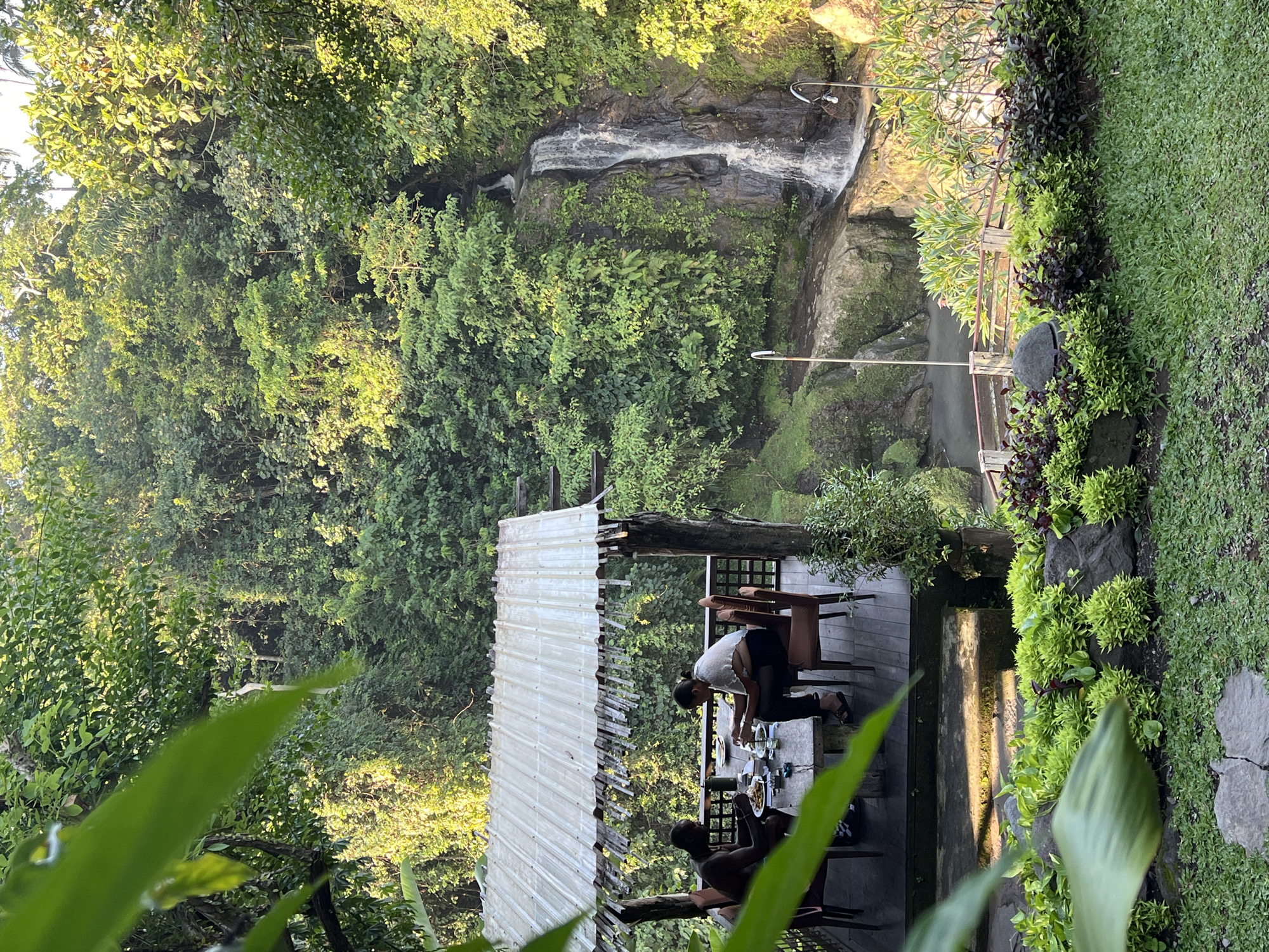 A picturesque scene captures a waterfall cascading into a pool. Lush green foliage surrounds the water. A wooden structure houses a dining area where two people are seated at a table. One person leans over the table. The surrounding landscape consists of trees and greenery, adding to the tranquil ambiance of the setting.