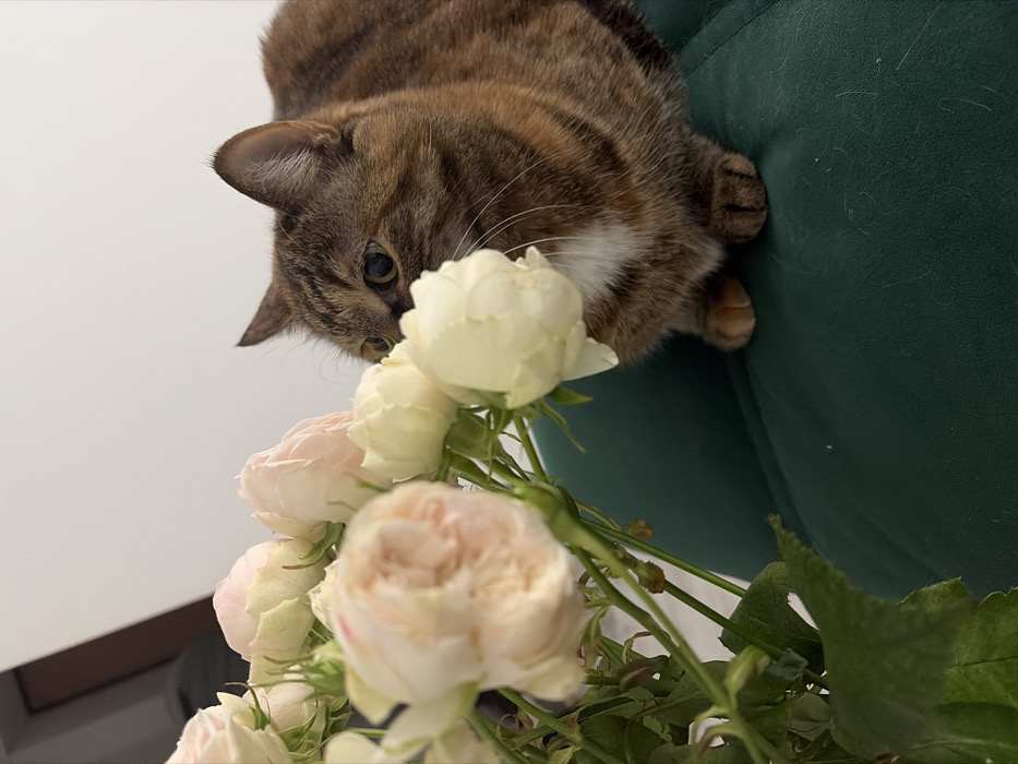 - "A tabby cat with brown and tan fur is perched on a green surface, peering down at a bouquet of roses" by FM-Uq6Av1, licensed under CC BY 4.0