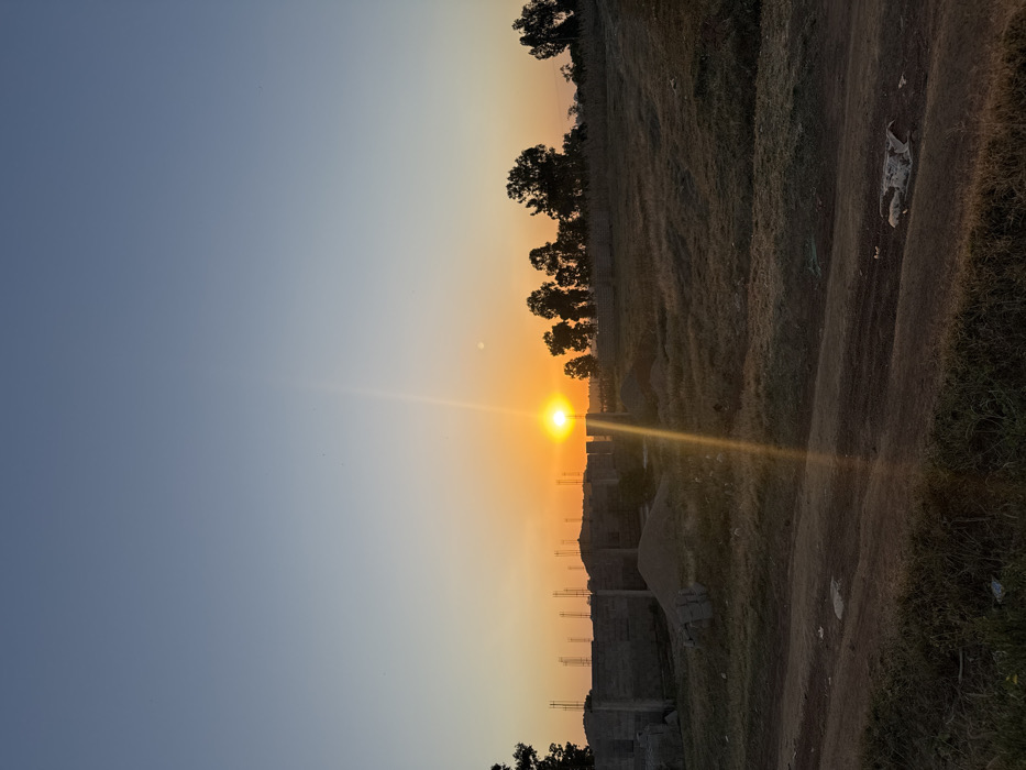 A serene sunset paints the sky in hues of orange and blue. The sun, a bright orb, sits on the horizon, casting a warm glow. Silhouetted trees stand on a distant ridge, while a partially constructed building occupies the foreground. An unpaved road runs along the right side. A smaller, paler orb hovers near the sun. The image evokes a sense of tranquility and the passage of time.