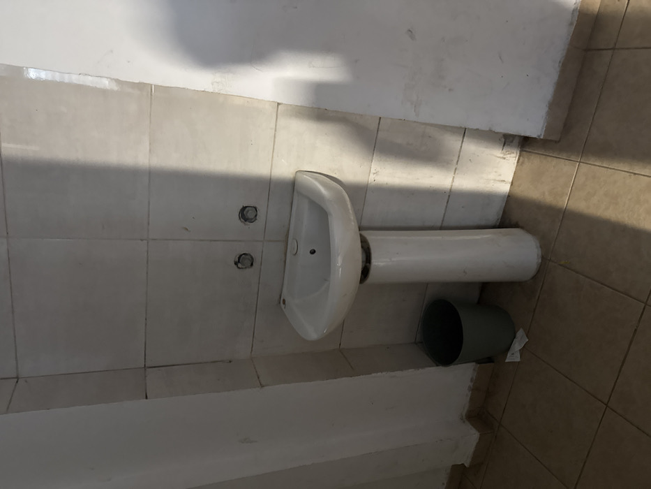 An interior image depicts a disused or unfinished utility space in Unknown, Unknown. A white ceramic pedestal sink is positioned centrally against a tiled wall, lacking faucets but showing two circular openings for their installation. The tiled wall features light-colored square tiles with visible, somewhat discolored grout lines. To the left of the sink, a dark grey plastic bucket rests on the tiled floor, next to a small piece of white paper debris. The floor is covered with light brown square tiles. Vertical shadows from an off-frame light source are cast across the tiled wall and floor. Adjacent walls, one on the left (partially obscured by a structural column) and one on the right, are painted white and show signs of wear and dirt accumulation, particularly near their bases. No individuals are present.