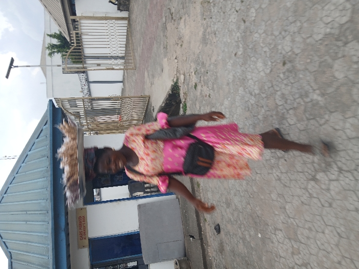 A woman in a patterned pink dress and a black shoulder bag walks on a patterned concrete path. She carries a large, dense load on her head. Behind her is a building with a blue-tiled roof and a sign that reads "CARS PARKED AT OWNER'S RISK". There is also a gate and a white building in the background, with a light pole and a tree visible. The overall scene appears to be outdoors, possibly in a residential or commercial area.