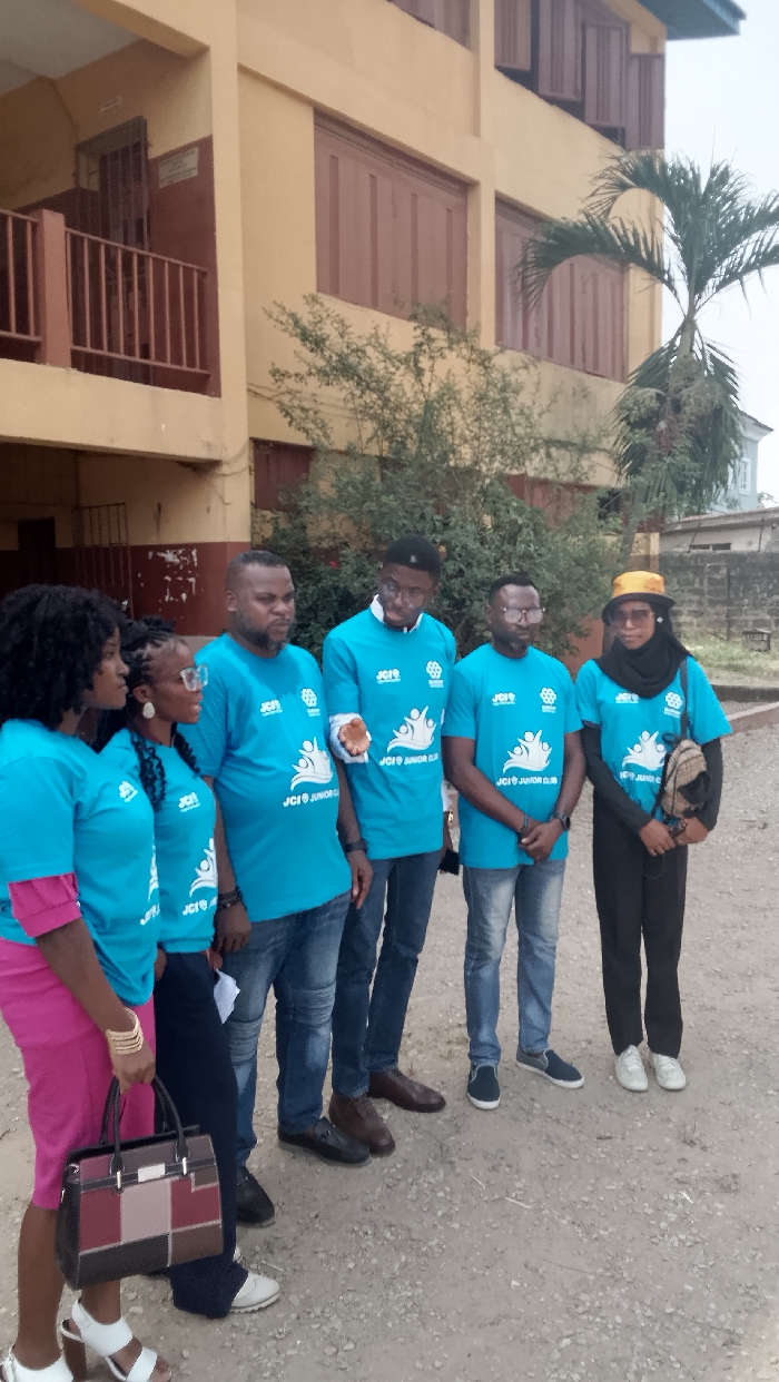 Six people are standing in front of a building in Street, Nigeria, located at latitude: 6.487, longitude: 3.36. They are wearing blue shirts that say "JCI'19 Junior Club." The building has brown wooden shutters on the windows. There is a palm tree growing outside the building. The ground is made of gravel. One woman has a black handbag. The people are looking at the camera. The image was taken during the day.
