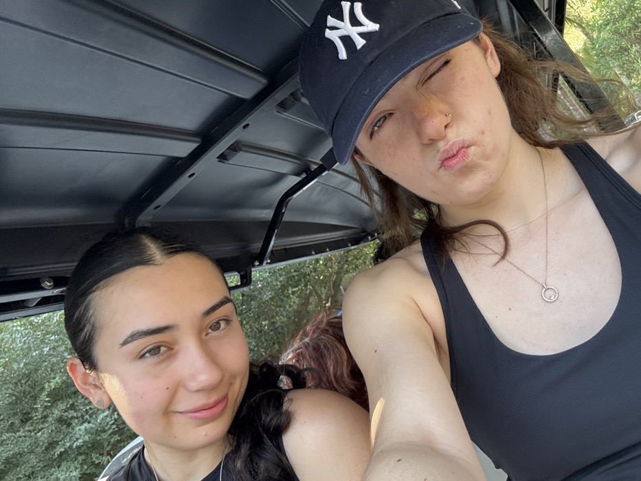 Two young women are in a golf cart, one with dark hair pulled back, smiling with a small silver necklace. The other wears a dark baseball cap with a white "NY" logo, a black ribbed tank top, and a silver necklace. She is pursing her lips in a playful pout. Trees and greenery are seen in the background through the open sides of the golf cart. The cart's roof is dark and boxy.