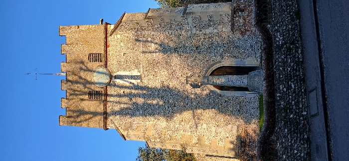 The image displays the west tower of St Mary's Church, situated on Quarry Street in Guildford, United Kingdom. The square tower is constructed primarily from irregular flint and rubble stone, with some brickwork visible. It features a crenellated parapet at its summit. Centered on the upper tower facade is a circular clock face with dark Roman numerals and light-colored hands, indicating an approximate time of 1:25 or 5:05. This clock is flanked by two rectangular louvered openings. A simple metal weather vane or finial protrudes from the very top of the tower. At the base of the tower, a dark, arched wooden doorway is visible. Directly in front of this entrance stands a tall, carved stone Celtic cross monument, positioned on a multi-tiered plinth. Long, distinct shadows from bare tree branches are cast diagonally across the sunlit stone facade of the church. Green foliage from surrounding trees or bushes is visible on both the left and right margins of the structure. In the immediate foreground, a low, dark stone wall separates the church grounds from a dark grey tarmac surface, which features a rectangular utility cover on its left side. The scene is illuminated by strong, low-angle natural sunlight under a clear, bright blue sky. No individuals or specific actions are depicted within the frame.