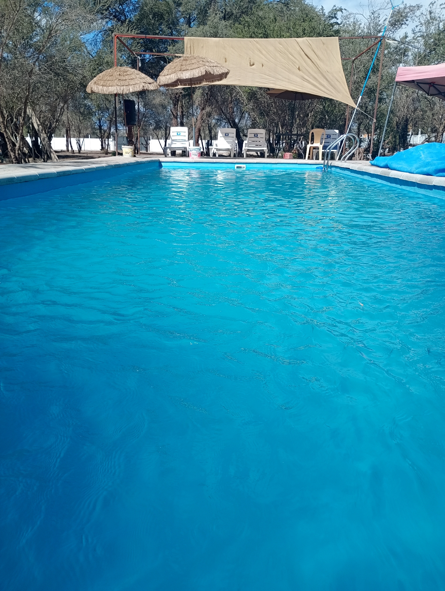 The image depicts a swimming pool in an outdoor setting, possibly a resort or recreational area, in Pozo Almonte, Chile. The pool is filled with clear, turquoise-colored water, suggesting it is well-maintained. Around the pool are a few lounge chairs, shaded by straw umbrellas and a large tan-colored awning. Trees surround the area, providing a natural backdrop. A blue pool cover sits near the edge of the pool. The environment appears sunny and dry. There are no people visible in the image.