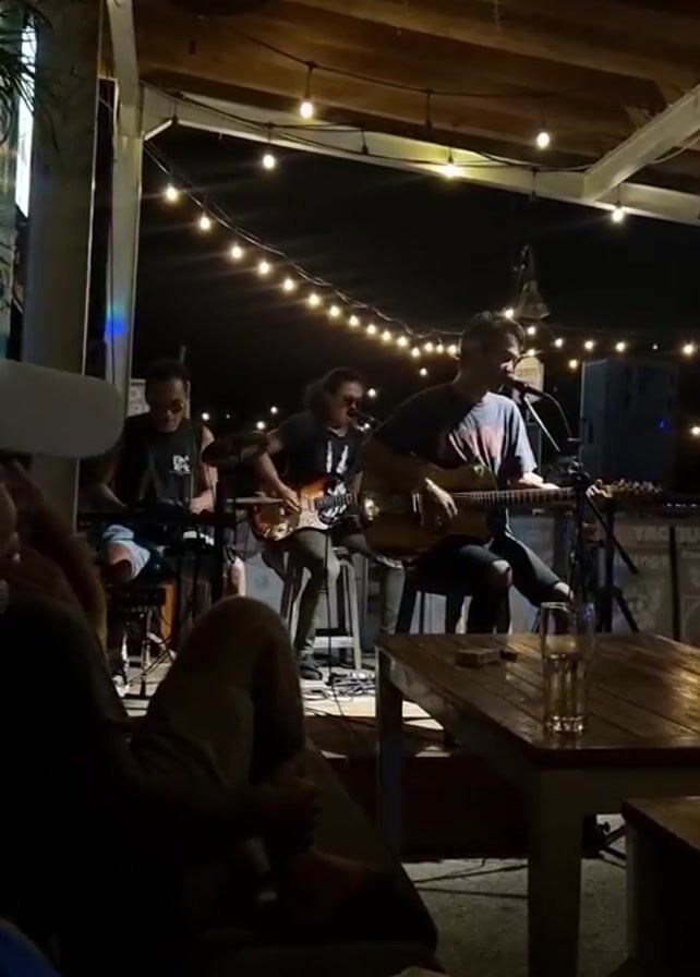 Under a string-lit patio, three musicians perform for a small crowd. The band consists of a drummer, an electric guitarist, and an acoustic guitarist who also sings into a microphone. Patrons lounge in the dark foreground, the focus being on the performance. A glass of liquid sits on a nearby wooden table, part of the patio's casual setup. The atmosphere is intimate and dimly lit, with a ceiling fan above adding to the relaxed vibe.