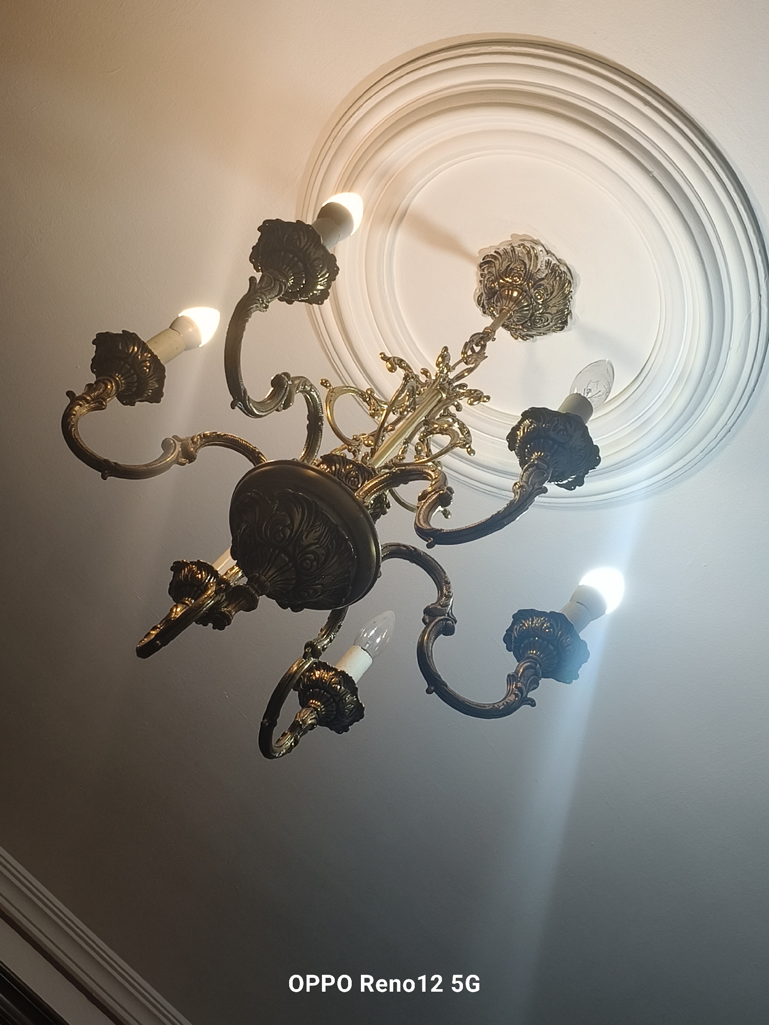 An upward-facing interior photograph captures an ornate six-arm chandelier suspended from a white, multi-ringed decorative ceiling rose against a light-colored ceiling. The chandelier is constructed from dark-toned metal, likely antique brass or bronze, featuring classical scrollwork and embellishments. Four of its six candle-style bulbs are illuminated, emitting a bright white light, while two bulbs remain unlit—one appearing as a clear filament bulb and the other as a white-coated bulb. A white architectural cornice is partially visible in the lower-left of the frame. The image includes a "OPPO Reno12 5G" watermark at the bottom center. This scene is located within the city of Cuéllar, Spain. No individuals, actions, or direct interactions are depicted.