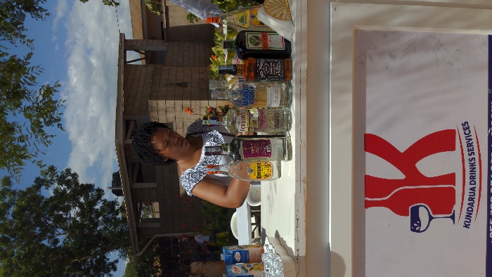 An outdoor scene in Soweto, Tanzania, features a beverage bar under bright daylight. A female individual, approximately in her 30s or 40s with dark braided hair and a white patterned top, stands behind a white counter, looking downwards towards the items on it. The counter displays an assortment of alcoholic beverages, including clear bottles of Konyagi, VOK, Gordon's gin, Absolut Vodka, Jack Daniel's whiskey, and Jägermeister, arranged in a line. To the left of the bottles are multiple blue cartons, a foil container with snacks, and a tray of small, clear glasses. A fanned stack of white napkins rests on the right. In the background, behind the attendant, white plastic tables and chairs are visible, with blurred figures of people. The distant background includes a single-story building constructed with light-colored blocks and a darker roof, along with lush green trees and blue sky with scattered white clouds. The foreground shows a white sign with a red "KUNDARUA DRINKS SERVICES" logo, depicting a bottle and a wine glass.