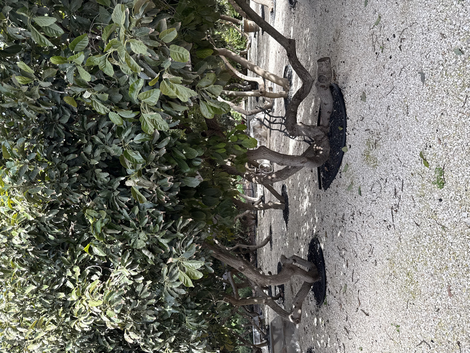 The image displays a cultivated outdoor area within Neta'im, Israel, featuring a grove of multiple mature trees. Each tree exhibits a thick, gnarled, and curving trunk, supporting a dense canopy of dark green, broad leaves. The ground is uniformly covered with light-colored, small-aggregate gravel, with scattered fallen leaves and twigs visible. The base of each prominent tree is encircled by a dark, circular mat, approximately 0.5 meters in diameter, integrated with visible drip irrigation lines. In the left background, a partial concrete or stone structure is discernible. Towards the center-right background, a large, irregularly shaped white object or sculpture is visible, alongside the front wheel and handlebars of a light-colored bicycle positioned behind a tree trunk. No individuals are present in the scene. The area is illuminated by natural daylight, casting distinct shadows from the trees onto the gravel.
