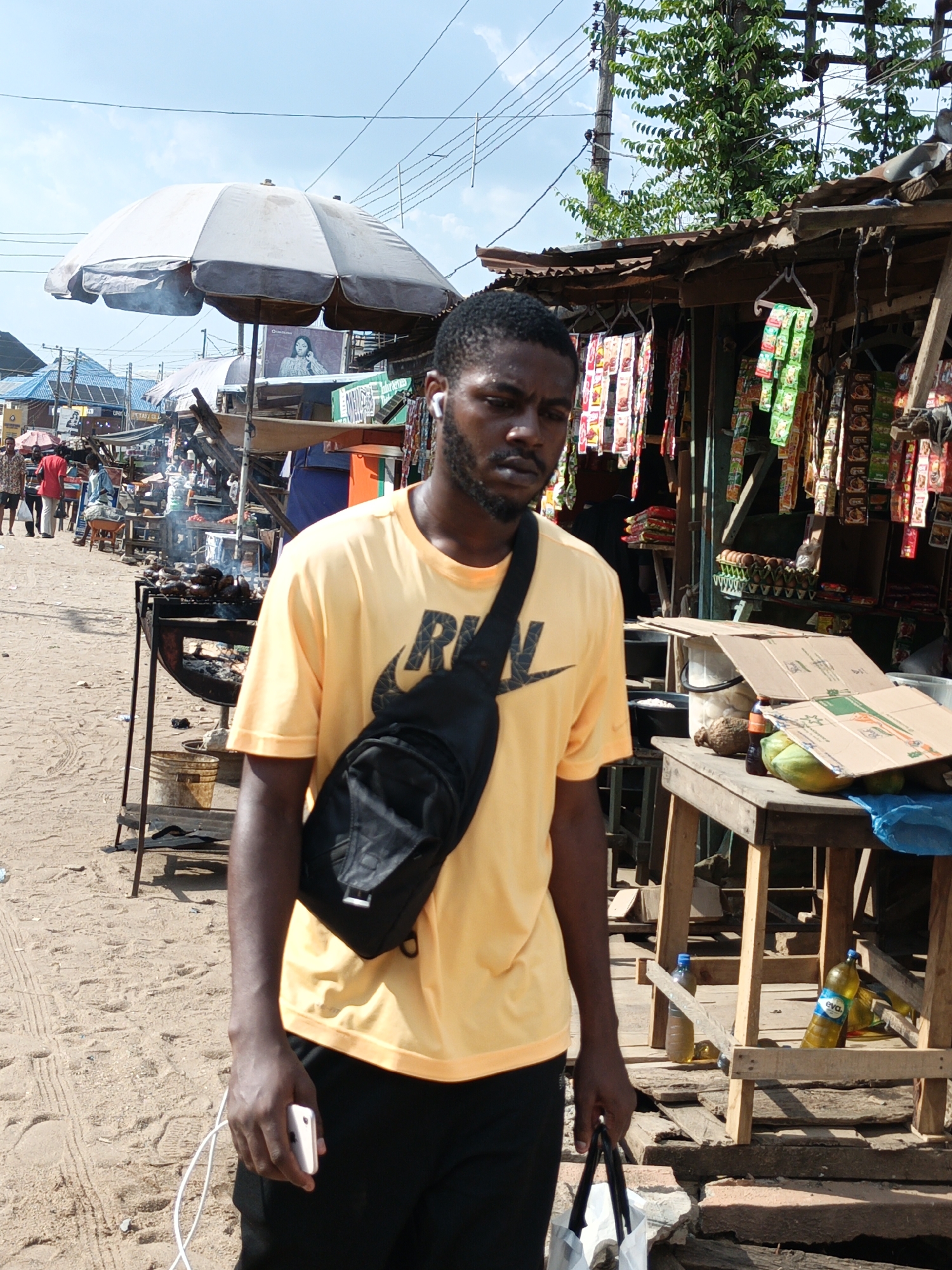 The image depicts an outdoor market scene in the city of Malessama, Chad. A male subject, appearing to be in his mid-20s to early 30s, of dark complexion with a short beard, is centered in the foreground, walking towards the viewer's right. He is wearing a yellow short-sleeved t-shirt with a black "NIKE" logo on the chest, black trousers, and a black sling bag worn across his chest. White wired earbuds are visible in his ears, with a white wire extending from his right ear. He holds a white smartphone in his right hand and a white plastic bag in his left hand. His gaze is directed slightly to the viewer's left. The ground is composed of sand or dirt, showing tire tracks and foot traffic. To the left, a large white and grey parasol provides shade over a market area. Beyond it, multiple market stalls with various goods are visible, along with other individuals walking in the distance. A charcoal grill with meat cooking is positioned on the left side of the frame, emitting smoke. Further back, a billboard featuring a woman's face is partially visible. To the right of the main subject, another market stall is constructed with wooden supports and a corrugated metal roof. This stall displays numerous packaged goods, including snacks and sachets, hanging from lines. On a wooden table in front of this stall, various items are present, including eggs in cardboard trays, green fruits resembling papayas, and cardboard boxes. Several plastic bottles, one labeled "Eva," containing yellow liquid (likely oil), are placed on and under the table. Overhead power lines traverse the blue sky, which has minimal cloud cover. Green foliage from a tree is visible in the upper right background behind the market stall structure.
