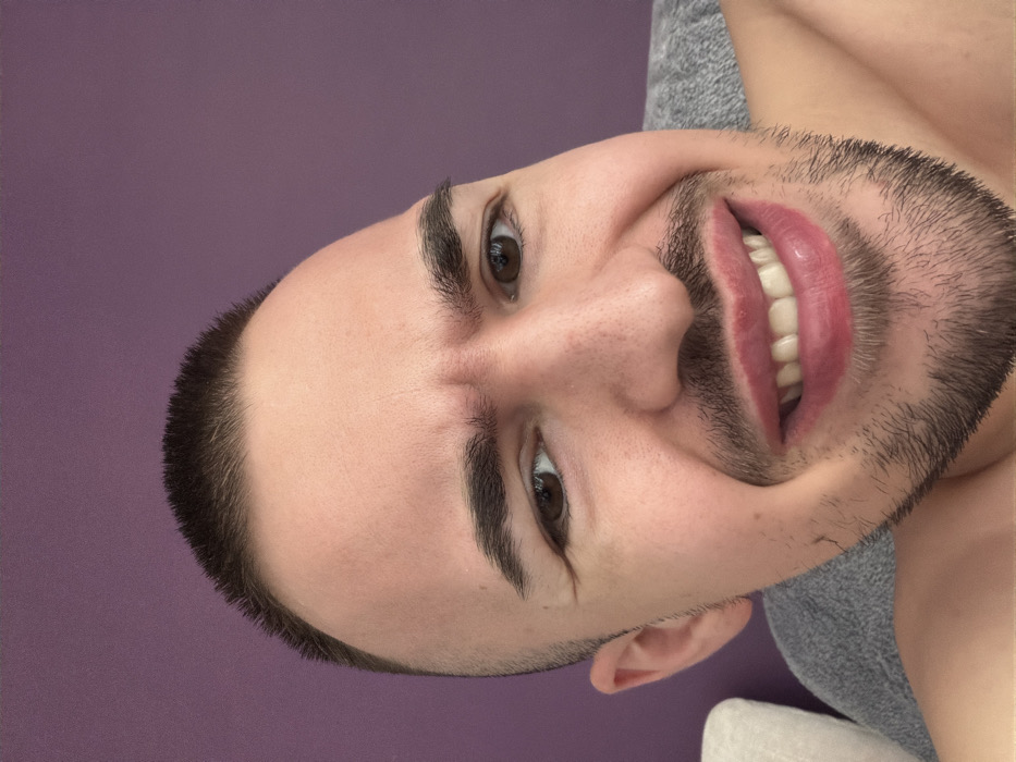The image displays a close-up, wide-angle portrait of a light-skinned adult male. He appears to be in his 20s or 30s, looking directly into the camera. He has short, dark, closely-cropped hair, prominent dark eyebrows, and brown eyes. A stubble beard and mustache are present on his face. His mouth is open in a wide, exaggerated grin, revealing upper and lower teeth. His eyebrows are furrowed, causing visible wrinkles on his forehead. The subject appears shirtless, with a bare shoulder visible in the lower right frame. The background is a plain, solid purple wall. A fragment of a light-colored object, likely a cushion or pillow, is partially visible on the far left, and a textured grey fabric object is visible on the right. The indoor setting provides no discernible landmarks or features to identify a specific location within the city of Sofia, Bulgaria.