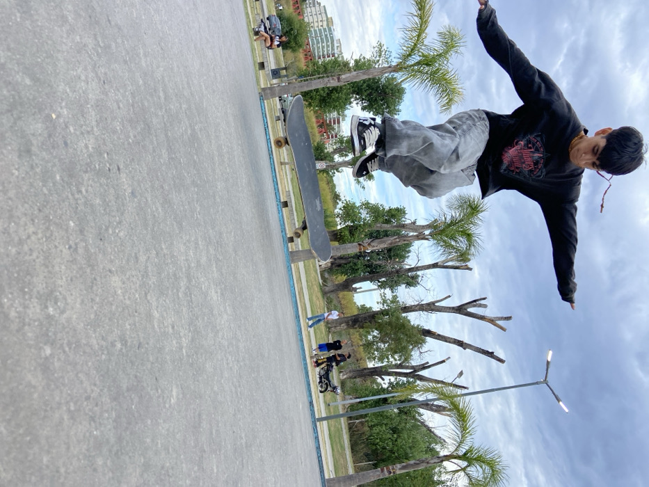 A skater in a black shirt and baggy gray pants jumps off his skateboard in mid-air. He wears black and white sneakers. The backdrop includes trees, a light pole, a cloudy sky, and a concrete surface with a blue border. Other people are visible in the background, including some on a scooter.