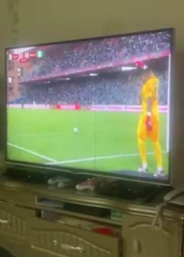 A TV screen shows a soccer game with the score at 0-2