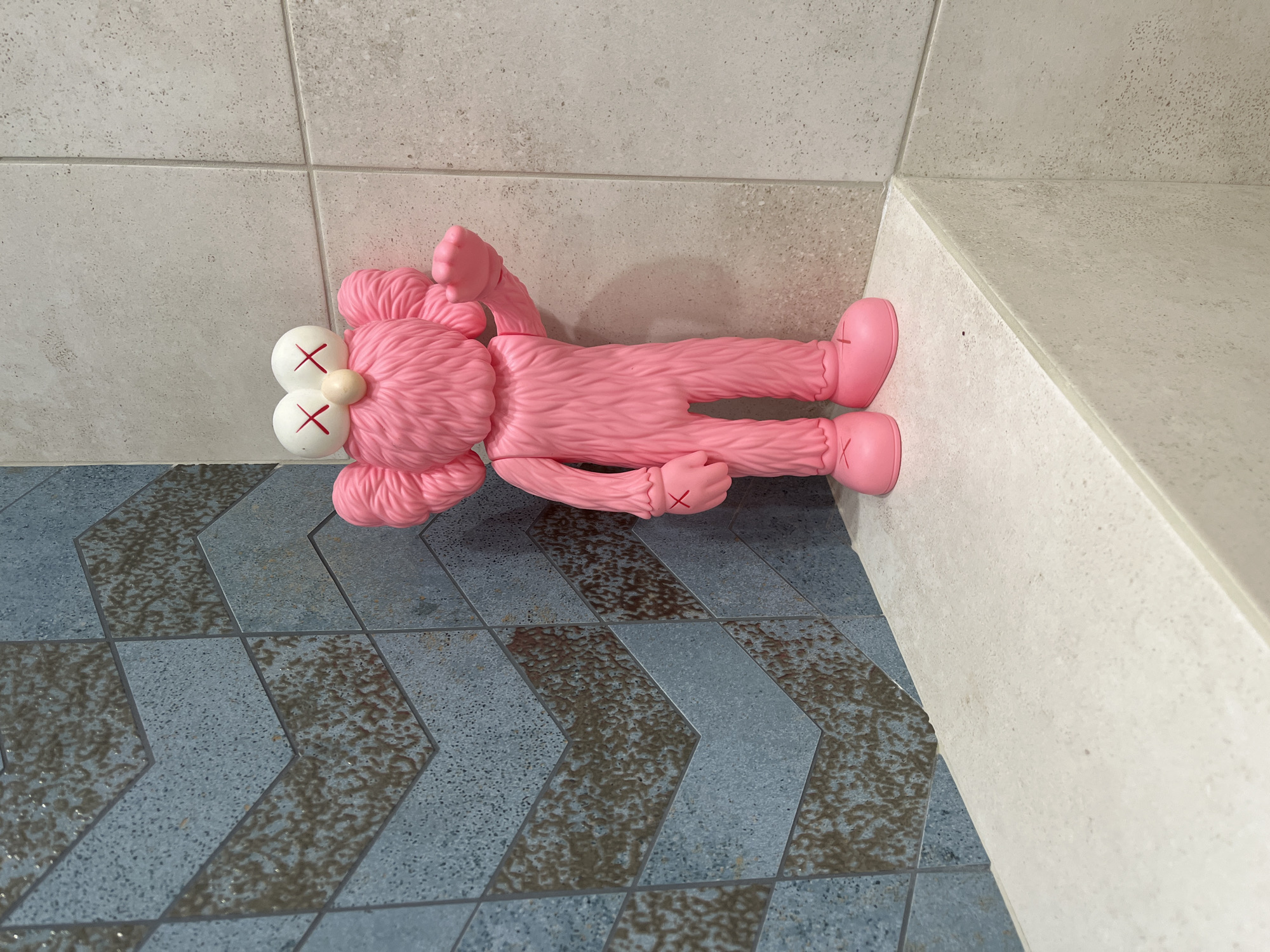 - "pink KAWS Companion figurine lying on a tiled floor" by FM-SkYw43, licensed under CC BY 4.0