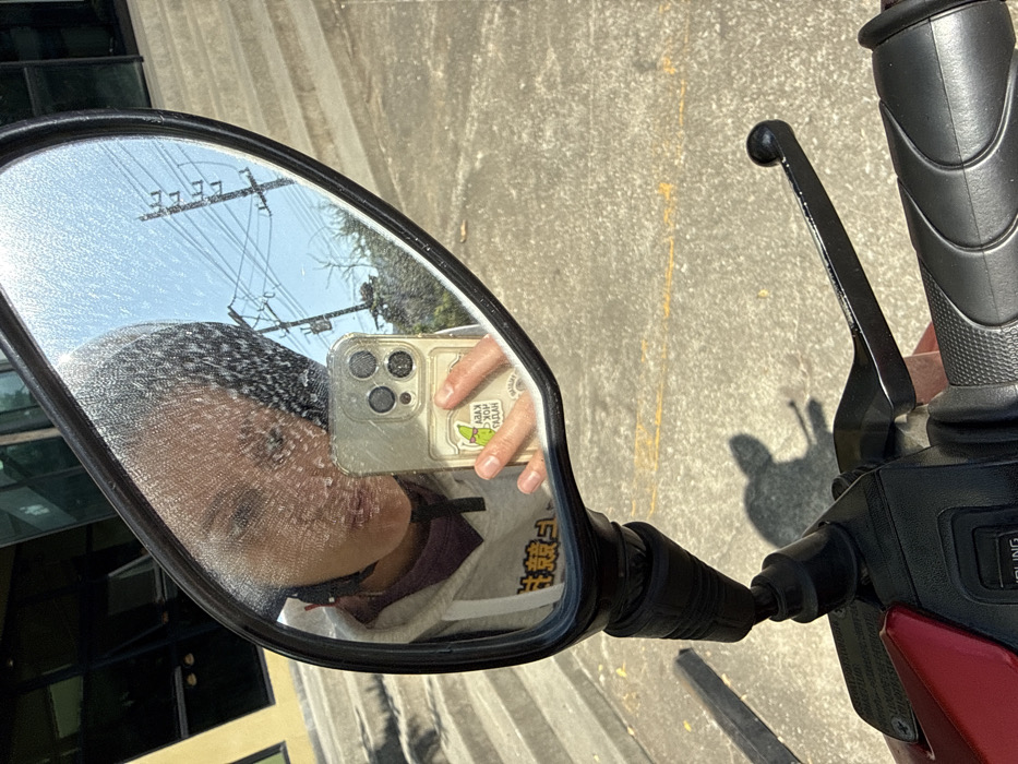 A selfie is reflected in a motorcycle mirror