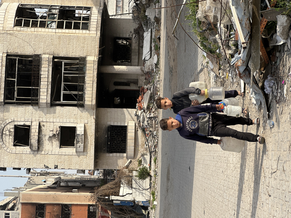 - "Two young boys walk on a paved street in front of a heavily damaged building in Gaza, Unknown" by FM-PSI0J3, licensed under CC BY 4.0