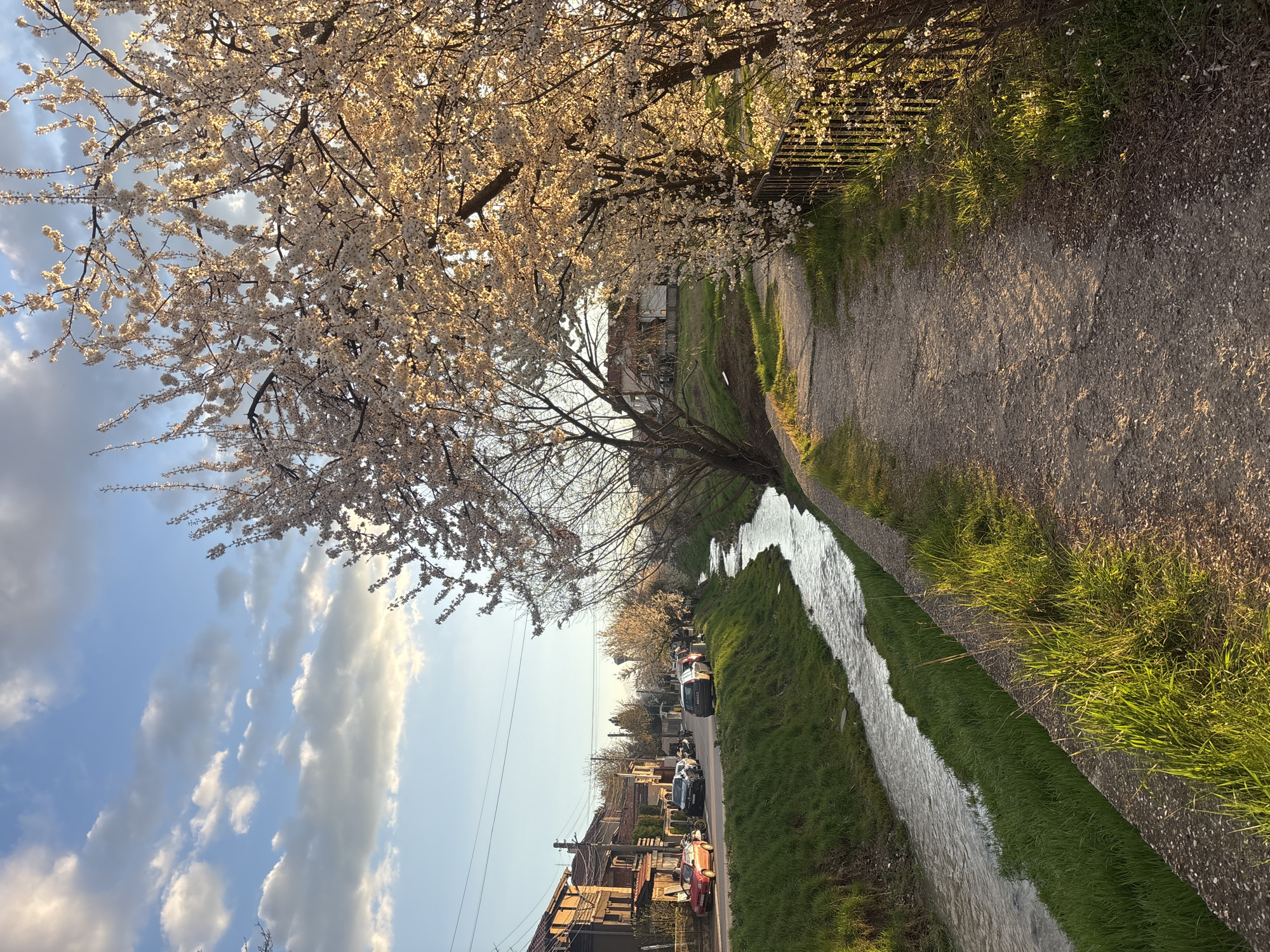 A landscape-oriented photograph displays a scenic view along a waterway, likely a canal or stream, adjacent to a road with residential buildings visible in the background. The scene is bathed in warm sunlight, suggesting either morning or late afternoon. In the foreground, a narrow, unpaved path runs alongside the waterway. The banks of the waterway are lined with green grass. The water itself is light in color. On the opposite side of the waterway, a road is visible, with cars parked along it. Beyond the road are houses and other structures. A row of trees, laden with white blossoms, overhangs the path and the waterway. The sky is visible in the upper left corner of the photograph, displaying a mix of blue sky and white clouds. The location is Bozhurishte, Bulgaria. The image composition doesn't provide identifiable people or interactions, primarily focusing on the natural elements.