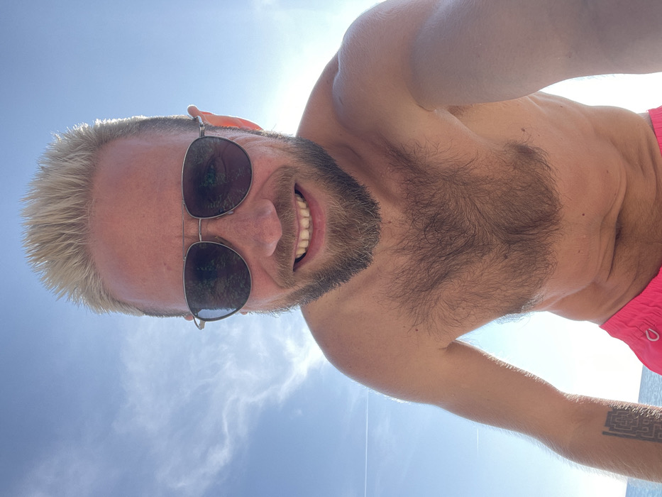 A low-angle self-portrait shows an adult male in Drobnići, Montenegro, against a clear blue sky containing sparse cirrus clouds and a single contrail. The male subject smiles, exposing his teeth, and wears dark aviator sunglasses. He has bleached blond, spiky hair and a brown beard. His bare, hairy torso is visible above bright pink swim shorts. A geometric pattern tattoo is visible on his left forearm. Direct sunlight from behind and above illuminates the subject. A body of water is partially visible in the lower left background.