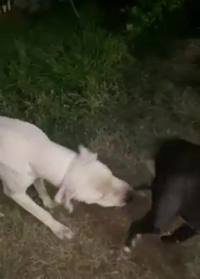 two dogs in an outdoor area with grass and some foliage. One dog is white and the other is black. The dogs approach each other and then start fighting, snarling and snapping at each other. There is a puppy behind the black dog.
