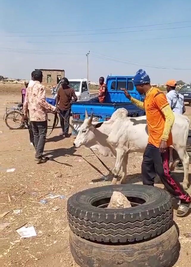 large white bull standing near a stack of two used tires on a dirt lot. The bull is being held by a man in an orange shirt and a blue knit cap. Another man in a patterned shirt and a black hat is holding a rope attached to the bull's nose. There are several other men standing around in the background, along with two pickup trucks and a bicycle. The sky is clear and blue. There is some scattered trash on the ground.