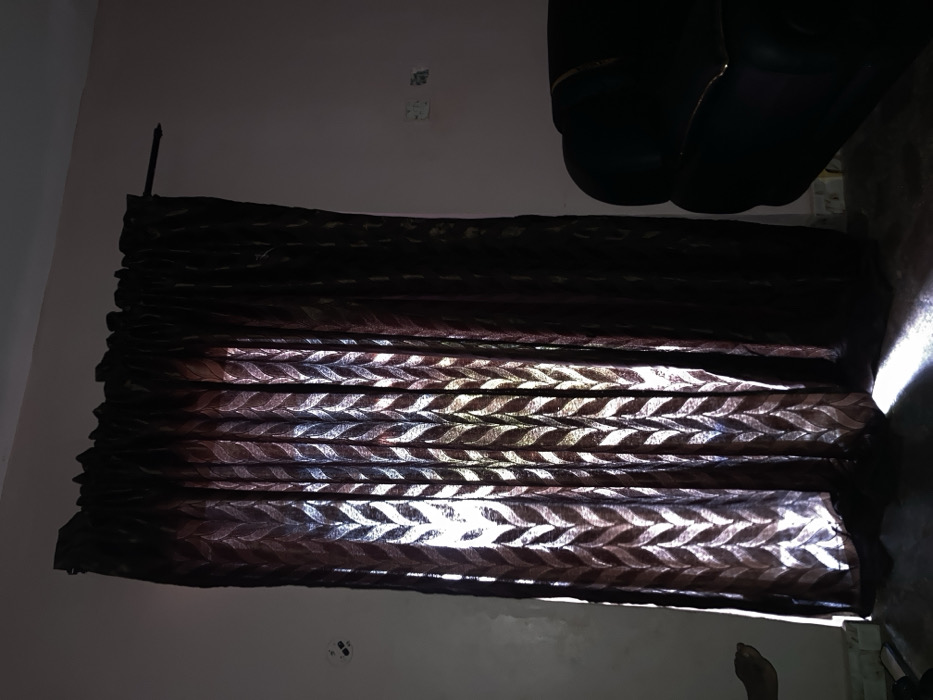 An interior view within a domestic residence in Narayi, Nigeria. The scene is dominated by a large window covered by dark brown curtains featuring a repeating chevron pattern, through which direct sunlight penetrates, illuminating the fabric and casting a bright rectangular light pattern onto the dark floor. The upper right corner reveals a dark curtain rod extending from the curtain. The walls are light-colored; a white circular fixture is present on the upper left wall, and two indistinct square wall fixtures are on the upper right wall. The top portion of a dark-colored armchair or sofa with visible gold trim is situated in the lower right. A partial human hand is visible on the lower left edge of the frame, near the wall-floor junction. The room is otherwise dimly lit, with strong backlighting from the window.