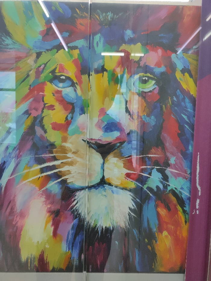 A large, abstract painting of a lion's head is displayed behind a reflective glass or acrylic panel in an interior location within the city of Chaikovsky, Russia