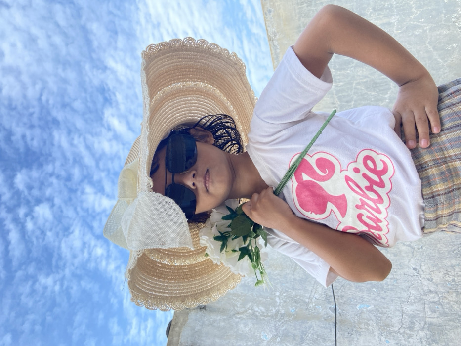 A young person wearing sunglasses and a large straw hat with a white bow is looking down at the camera. They hold a white flower in their hand and are wearing a t-shirt with a pink "Barbie" logo. The background shows a blue sky with white clouds, and a concrete surface. The image is rotated.