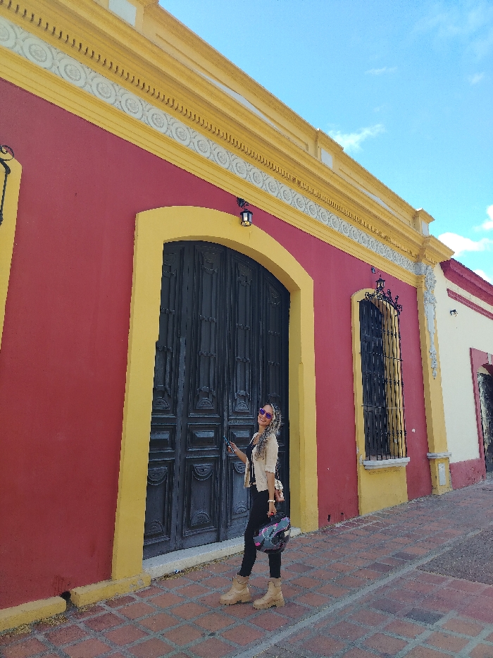 A forensic examination of the image reveals a vibrant urban street scene in La Victoria, Venezuela, under a clear blue sky with sparse white clouds. **Environment and Structure:** The central subject is a colonial-style building facade painted a striking red, framed by bold yellow trim. A large, dark-colored double door, featuring vertical paneling and ornate details, is centrally located, encompassed by a yellow arched frame. Above this door, a black metal lantern-style light fixture is mounted. To the right of the door, a tall, narrow window with intricate black wrought-iron grates is present, also outlined in yellow. Another similar black lantern is mounted above this window. The upper section of the building features a prominent yellow cornice with a decorative white frieze displaying repeating circular patterns. To the far right, a portion of an adjacent building with a cream-colored facade and red trim is visible. The ground is paved with reddish-brown interlocking bricks, laid in a diagonal pattern, forming a sidewalk. **Individuals and Objects:** A female subject stands on the sidewalk, positioned slightly to the right of the large double door, facing partially towards the camera. She has long, curly blonde hair and wears pink-framed sunglasses. Her attire consists of a light-colored (likely beige or cream) long-sleeved cardigan over a dark top, black pants, and tan/beige chunky-soled combat boots. In her right hand, she holds a dark-colored smartphone, positioned near the yellow door frame. Her left hand holds a black motorcycle helmet with pink and grey accents. A small, light-colored crossbody bag is visible hanging on her left side. **Actions and Interactions:** The woman is posing for the camera, exhibiting a smile, suggesting an intentional photograph. Her body is slightly angled, and her gaze is directed towards the viewer.