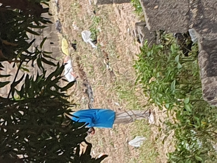 A person wearing blue shorts and light-colored skin is lying prone on the ground amidst debris and grass. The surroundings include patches of bare dirt, scattered trash, and vegetation. A tree partially obscures the left side of the frame, and a stone structure borders the right. The image is taken from an elevated vantage point, suggesting an overview perspective of the scene.