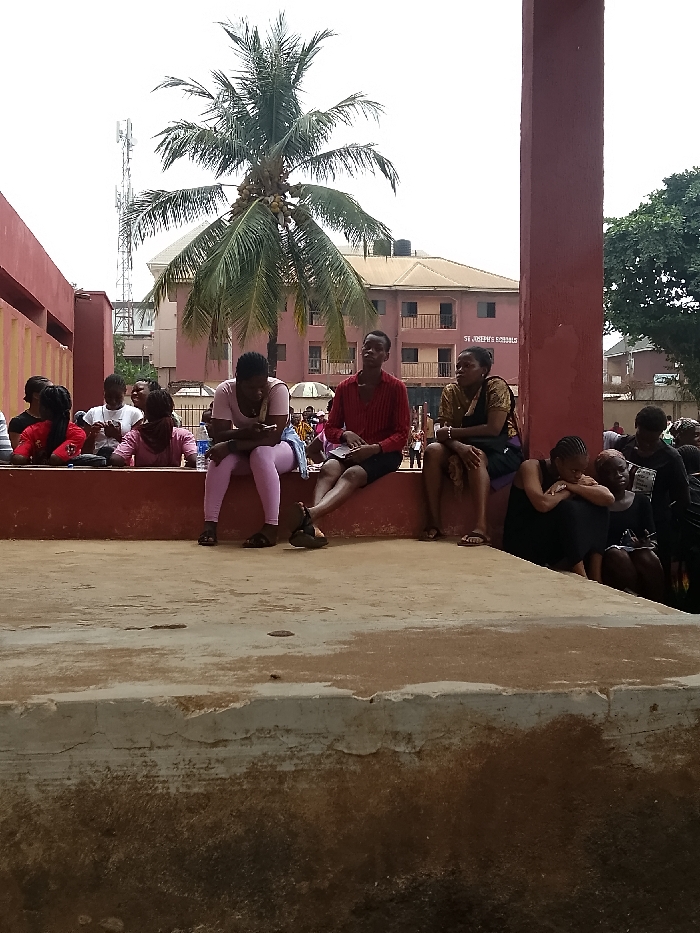The scene depicts an outdoor area in Umuokpu, Nigeria. In the foreground, a concrete platform exhibits dirt and weathering. Directly behind this, a reddish-brown concrete ledge is visible. A group of approximately 15 individuals, primarily young adults, occupies the midground. A woman wearing a light pink top and leggings is seated on the ledge, looking down at a mobile phone held in her hands. Adjacent to her on the right, a man in a red collared shirt and dark shorts sits on the ledge, facing forward with legs crossed at the ankles. Further right, another woman in a dark patterned top is seated on the ledge. A large reddish-brown concrete pillar obstructs the view of additional individuals positioned further right and below the ledge, one of whom is a woman in a dark dress seated with her knees drawn to her chest. To the left, a reddish-brown wall is partially visible. In the background, a tall palm tree with coconuts stands prominently. Behind the tree, a three-story reddish-brown building is identifiable with "ST. JOSEPH SCHOOLS" inscribed on its facade. A communications tower is visible to the far left in the background. The sky is overcast.