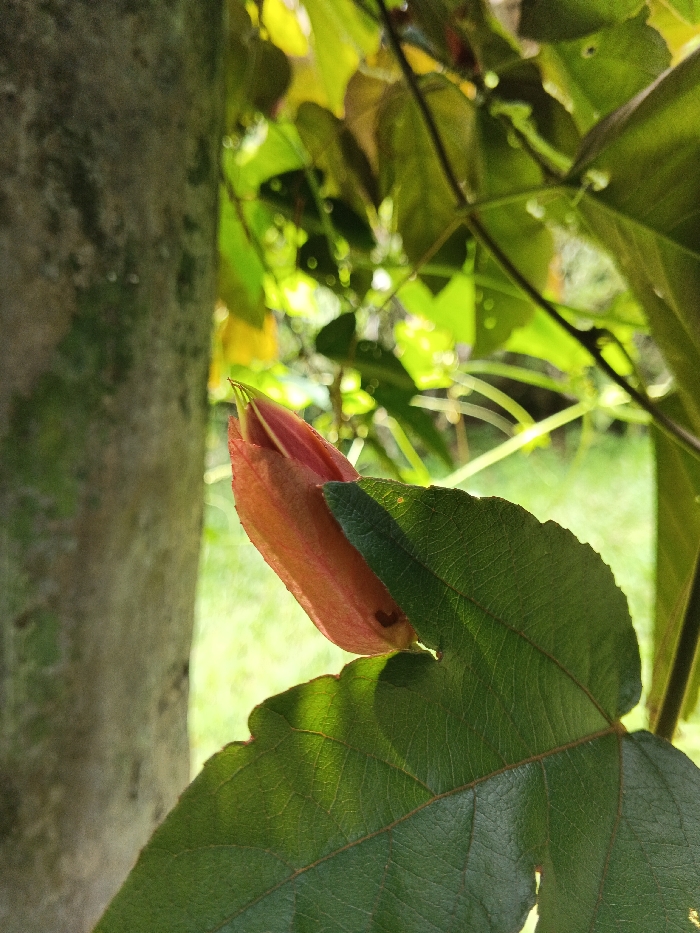 A single, elongated reddish-orange flower bud is partially visible, positioned centrally within a natural outdoor setting in Masulog, Philippines. The bud is partially obscured by a prominent, dark green leaf with visible venation, located in the lower right and extending towards the center. To the left, a vertical section of a light brown-grey tree trunk with discernible bark texture is present, out of focus. The background consists of a blurred mass of green foliage, including leaves and slender plant stems, suggesting a dense vegetated environment under natural daylight conditions. No human subjects, animals, or man-made objects are present.