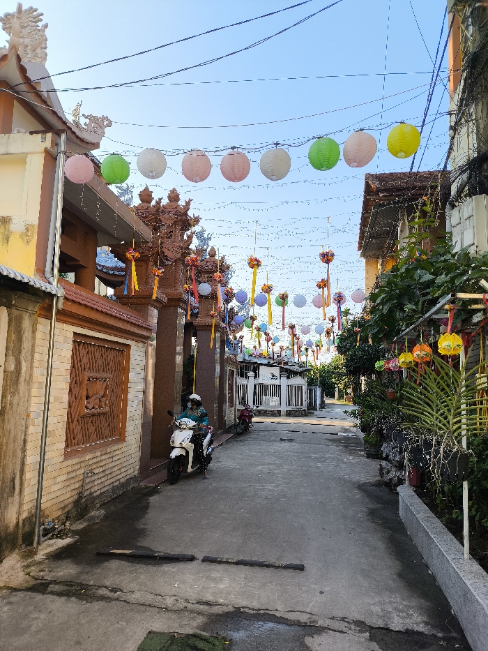 The image displays a narrow urban alleyway in Thành phố Quảng Ngãi, Vietnam, under a clear blue sky. On the left, a multi-story building with a light-colored facade and a terracotta-tiled roof exhibits ornate architectural details, including a patterned wooden relief panel. Adjacent to it, a large, intricately carved entrance gate of reddish-brown material is decorated with smaller lanterns and colorful ribbons. A single individual, dressed in a light blue jacket and white head covering, is seated stationary on a white scooter next to the left wall. On the right, a building with a similar terracotta-tiled roof is partially obscured by lush green foliage, from which smaller, brightly colored lanterns are suspended. The concrete paved ground contains two black, horizontal speed bumps. Overhead, numerous strings of spherical paper lanterns in colors including pink, green, white, and yellow are strung across the alley, alongside many utility wires and additional decorative lanterns with ribbons. Further down the alley, a red scooter is visible, and the path terminates at a white, gated structure.