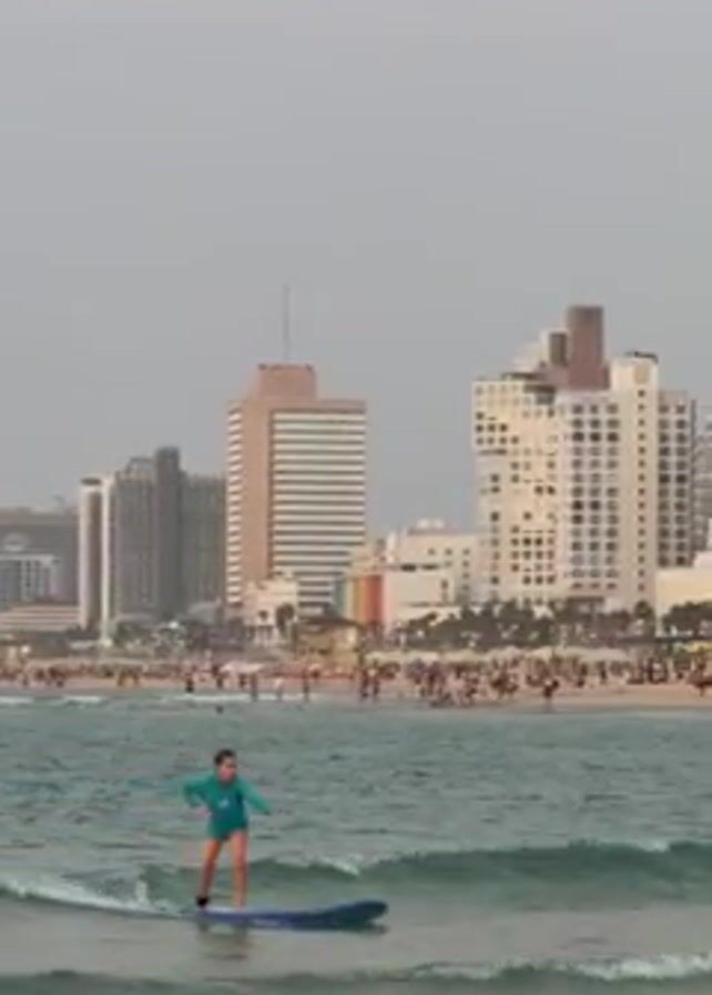 A woman is surfing on a blue surfboard in the ocean. She is wearing a long-sleeved aqua shirt and shorts. In the background, a beach is crowded with people, and several high-rise buildings dominate the skyline. The sky is overcast.