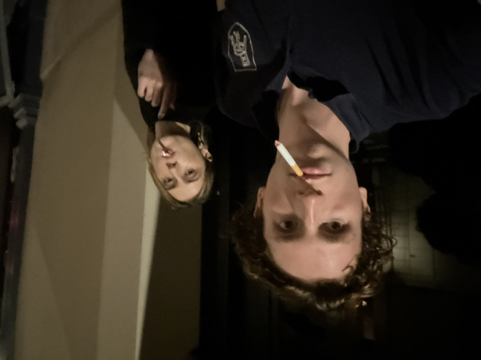 The image captures two young adult individuals, a male and a female, standing outdoors or in a dimly lit urban setting at night. The precise location within Paris, France, is not visually discernible, but the visible architecture suggests a building exterior. The male, positioned in the foreground and slightly to the left, has curly brown hair and wide eyes, looking directly at the camera. He wears a dark blue polo shirt featuring a light-colored crest or emblem on the left chest. A lit cigarette is held between his lips, its tip glowing orange. Behind and to the right of the male, the female subject is partially visible. She has light brown hair and also looks towards the camera. A lit cigarette is held between her lips, and she wears a dark top. Her right hand is raised near her chin. The background behind the male is dark and indistinct, while to the right, a cream or beige-colored architectural building facade, possibly featuring a pilaster or vertical panel, is partially visible. The scene is illuminated in a way that highlights the subjects' faces against the dim environment. Both individuals are actively smoking cigarettes.