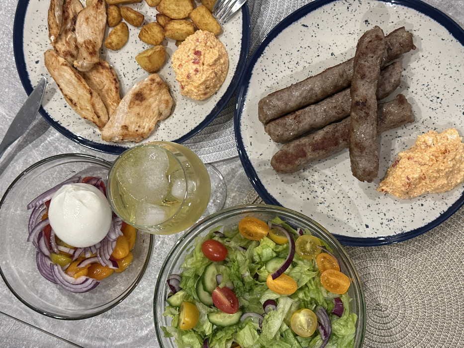 The image displays an overhead view of a multi-course meal meticulously arranged on a light gray, textured dining surface, potentially a table or countertop. The specific location within the city of Vratsa, Bulgaria, cannot be determined from the visual evidence provided. The meal consists of various dishes and a beverage. In the upper left quadrant, a clear glass bowl holds a salad composed of sliced yellow bell peppers, red onion rings, and a large, white spherical object, identifiable as burrata or fresh mozzarella cheese, positioned centrally atop the vegetables. To the upper right, a white ceramic plate with a dark blue speckled rim contains several pieces of grilled chicken breast, numerous golden-brown roasted potato wedges or cubes, and a dollop of a reddish-orange spread, likely a pepper-based relish or a flavored cheese spread. A silver-colored knife and fork are partially visible on or near this plate. In the lower left, another clear glass bowl presents a green leaf lettuce salad, garnished with sliced cucumbers, halved red cherry tomatoes, halved yellow cherry tomatoes, and slivers of red onion. Positioned in the lower right, a second white ceramic plate, matching the first with its dark blue speckled rim, features five grilled, cylindrical meat items, consistent with skinless sausages such as ćevapi, arranged in a stacked formation. A dollop of the same reddish-orange spread accompanies these meat items. A clear stemmed glass, filled with a light yellow beverage containing several ice cubes, is situated centrally within the arrangement of food, between the bowls and plates. A light-colored, woven placemat with a striped pattern is partially visible beneath the plates and beverage glass, resting on the primary dining surface. No individuals are present in the frame, and no direct actions or interactions are depicted, implying the scene is set for an impending meal.