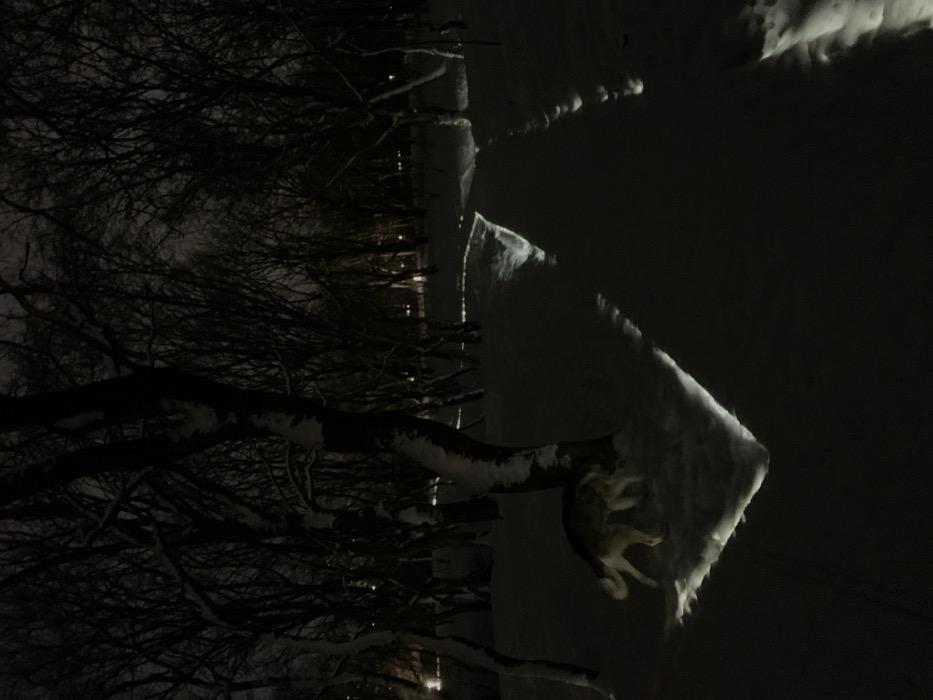 At night, snow-laden tree branches fill the left side of the image. Bare branches intertwine against the dark sky. To the right, snow forms sharp angles, and an animal sits perched on the snow near a tree branch. Light from the street illuminates the snow.