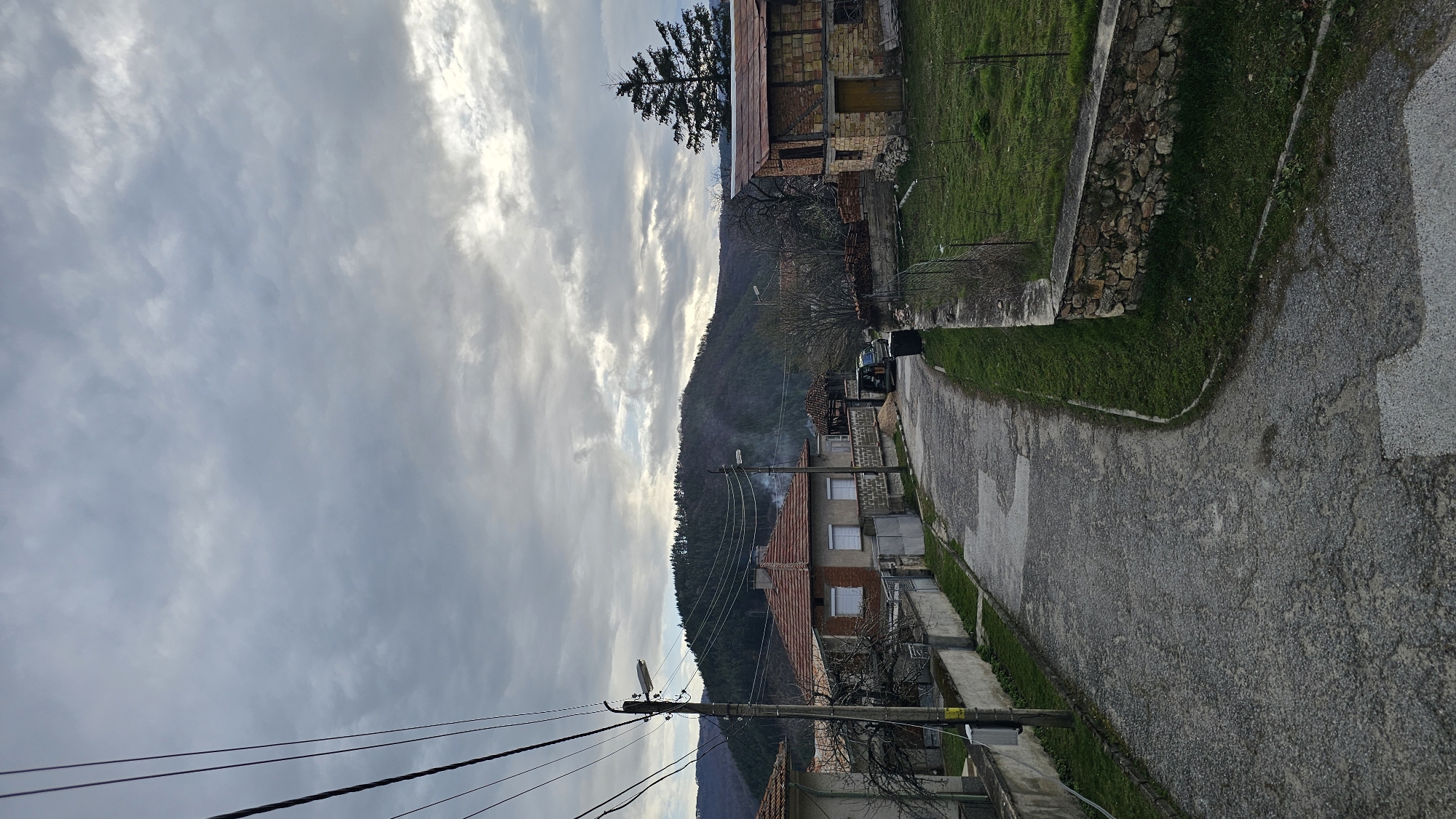 This is an exterior shot of a street in the Bulgarian city of Klisura. The road is made of asphalt, with grass and buildings lining the right side. The buildings range from stone structures to two-story homes with red-tiled roofs. A mountain covered in trees rises in the background. Above, a cloudy sky dominates the upper portion of the shot. Electrical poles and wires are visible in the foreground. Smoke rises from a building's chimney. No people are clearly visible in the image.