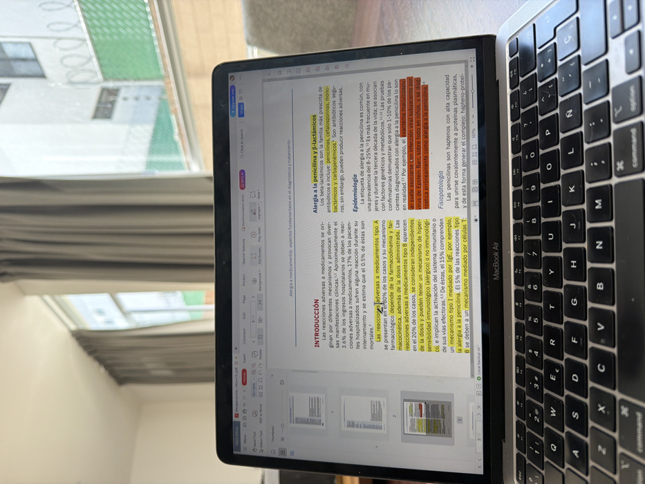 A laptop screen displays a medical text in Spanish titled "Alergia a la penicilina y B-lactámicos." The text discusses penicillin allergies, their prevalence, and causes, mentioning reactions to medications and the role of beta-lactam antibiotics. The text notes that many diagnosed with penicillin allergies are not allergic, often due to misdiagnosis from viral infections. The keyboard of a MacBook Air is visible, with keys slightly blurred due to the depth of field. A window in the background is partially visible, showing a hint of greenery outside.
