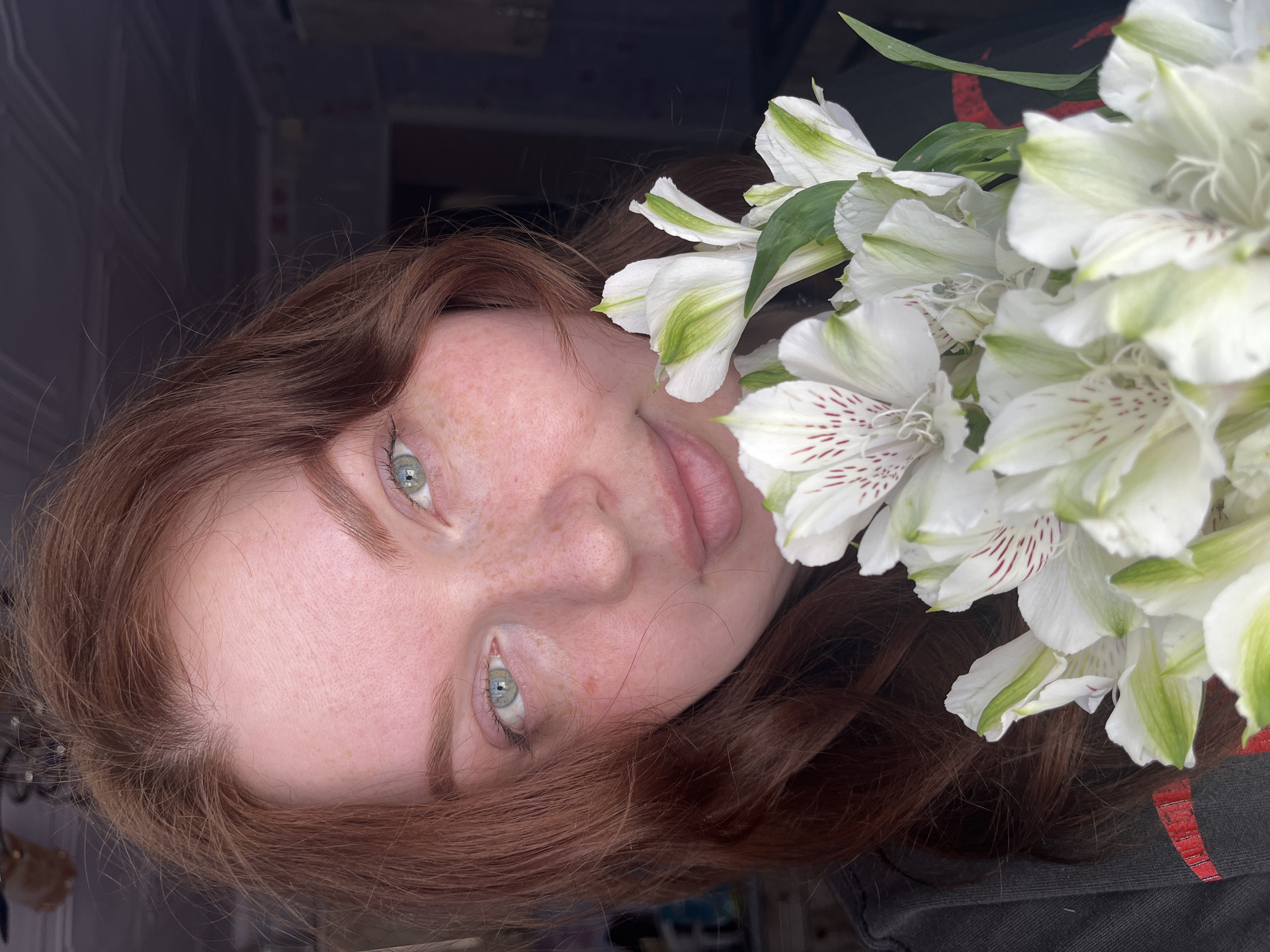 A person with red hair and green eyes is holding a bouquet of white alstroemeria flowers. The person's face has freckles. The background is dark and appears to be indoors. The image is oriented sideways. There is no indication of the city of Kuyeda, Russia in the image.