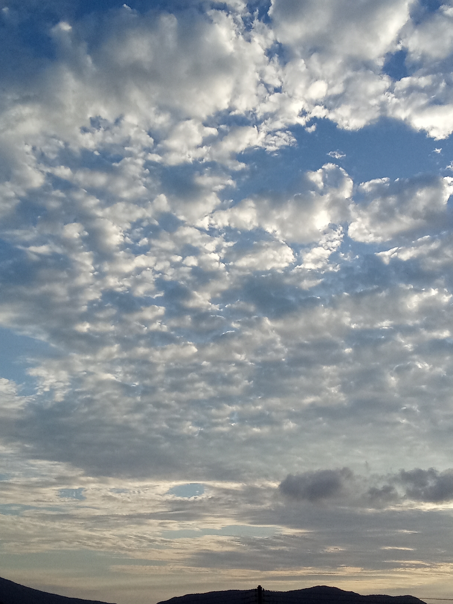 sky filled with numerous white and gray clouds, with patches of blue sky visible in between