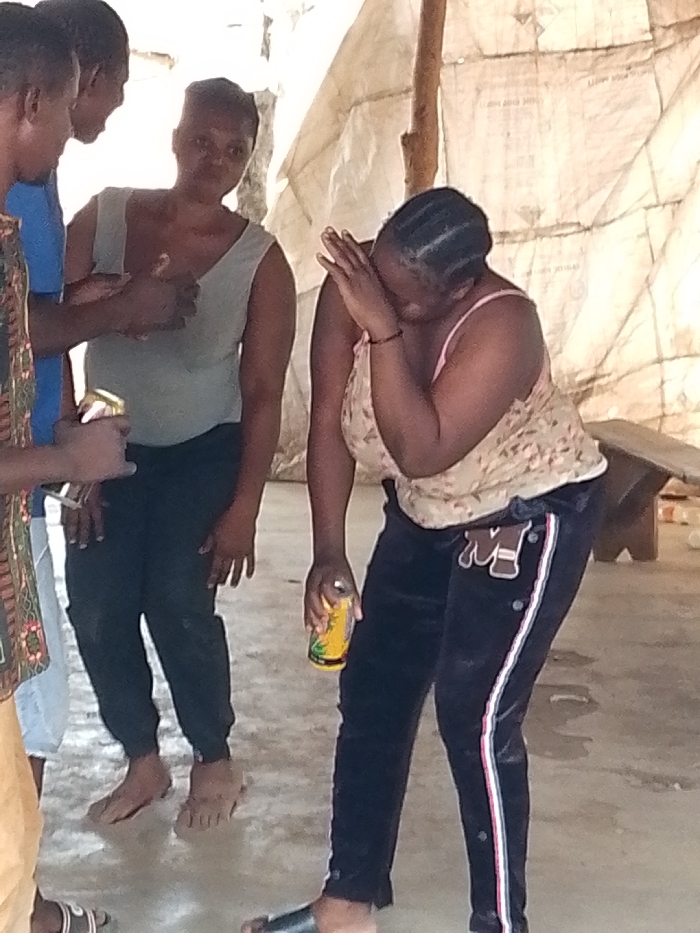 The scene depicts four individuals under a temporary shelter in Oduma Hill, Nigeria. The shelter features walls constructed from light-colored, possibly tarpaulin or sack material, supported by wooden poles, over a concrete or light-colored floor. On the left, two men are partially visible. The leftmost man wears a patterned shirt and light trousers, holding a thin, white object, possibly a cigarette. The second man wears a blue shirt and is engaged in conversation or interaction, facing towards the center. In the center, a woman with dark hair, wearing a grey tank top and dark trousers, stands barefoot, looking towards the right with a neutral expression. On the right, a second woman with dark braided hair is bent forward, covering her face with her right hand in a gesture suggestive of distress or discomfort. She wears a light-colored, floral-patterned camisole with pink straps, dark velvet-like track pants with a white and red stripe and snap buttons along the side, and dark slide sandals. Her left hand holds a yellow and green "Hunters" brand beverage can. In the background to the far right, a wooden bench is partially visible, along with some scattered plastic bottles on the ground.