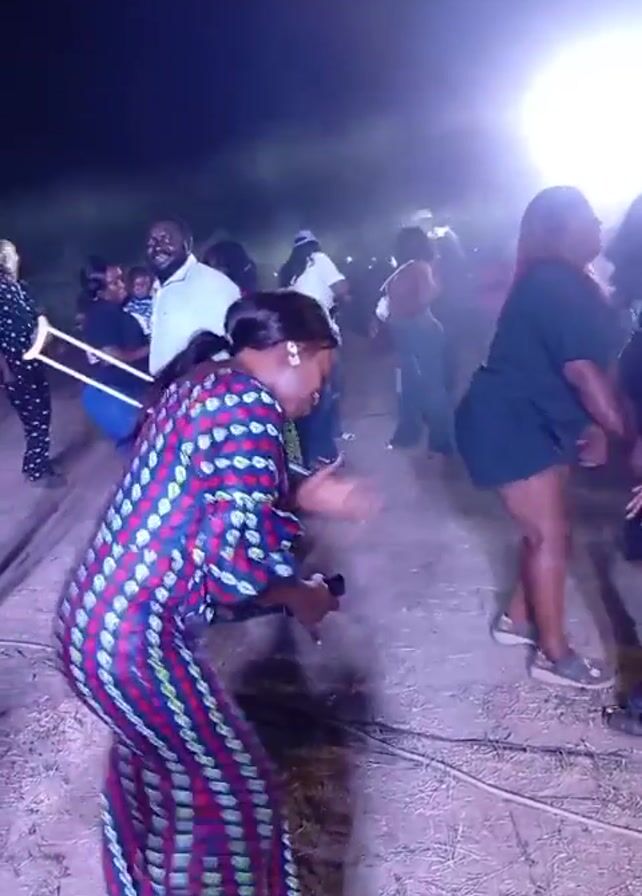 The video depicts a group of people dancing at what appears to be an outdoor event at night. The location seems somewhat grassy or dirt-covered. A bright light source is visible in the background. The camera focuses on a woman in the foreground wearing a long, patterned dress with a high ponytail. She is actively dancing. Another woman wearing a dark dress and sneakers is also dancing nearby. Several other individuals are visible in the background, some dancing and some watching. There are also a few individuals holding what appear to be musical instruments, including a trombone.