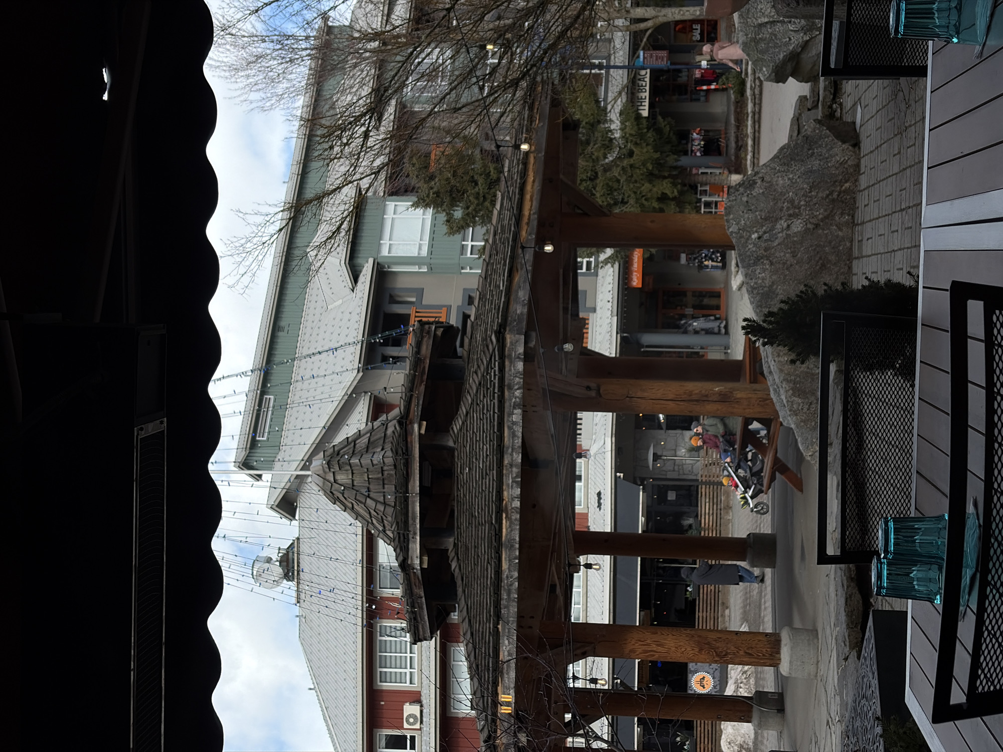 The image depicts an outdoor setting in Whistler, Canada, from a sheltered vantage point. A dark awning with scalloped edges partially frames the left side of the scene. The view extends into a pedestrian area with multiple shops and buildings, revealing a wooden pergola with a layered roof structure as a central element. People are present, though their details are limited; some are visible as passersby. The environment shows buildings of varied heights and architectural styles, with bare trees suggesting a transition into spring. Details of the scene include string lights draped overhead, rocks used as landscaping elements, and outdoor seating with tables. The sign for "The Beach" is visible.