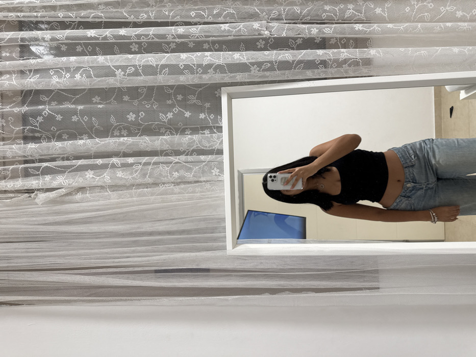 An indoor scene in Hod HaSharon, Israel, depicts a person taking a mirror selfie. The individual, dressed in a black cropped tank top, light-wash baggy jeans, a silver necklace, and beaded bracelets on their left wrist, holds a white smartphone to obscure their face. The full-length mirror, framed in white, reflects a light-colored room with a wall-mounted screen displaying a blue image and a light-colored tiled floor. Adjacent to the mirror, a white wall is visible on the left, and a window covered by two layers of sheer white curtains—a plain mesh layer and an outer floral lace patterned layer—is visible on the right.